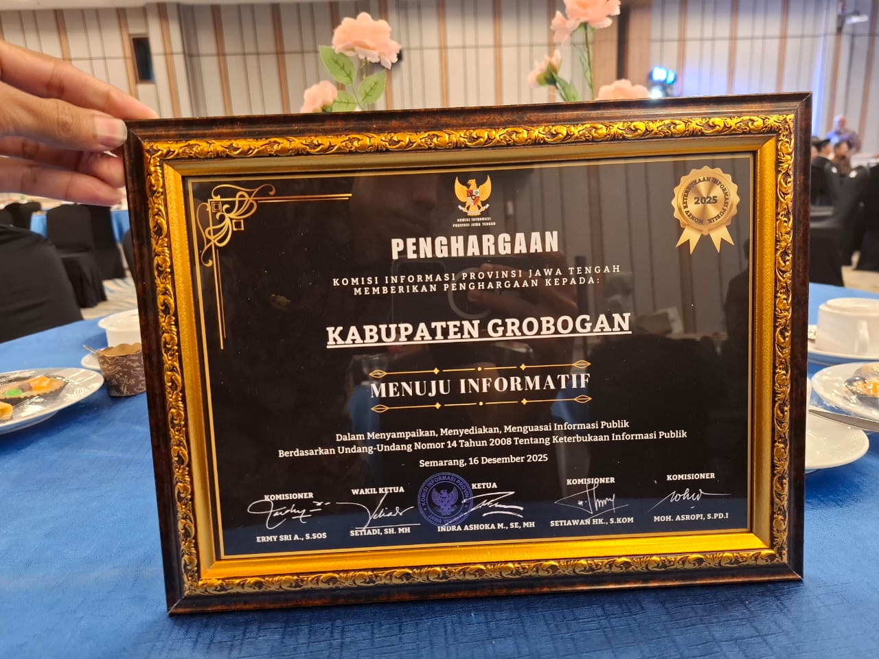 Komitmen tersebut tercermin dalam capaian Pemerintah Kabupaten Grobogan pada Monitoring dan Evaluasi (Monev) Keterbukaan Informasi Publik (KIP) Tahun 2025 yang diselenggarakan Komisi Informasi Provinsi Jawa Tengah. Pada Malam Penganugerahan Keterbukaan Informasi Publik di Semarang, Selasa malam (16/12/2025), Asisten Pemerintahan dan Kesra Sekda Grobogan, Kurnia Saniadi, mewakili Bupati Grobogan menerima predikat Menuju Informatif dengan nilai 88,25.