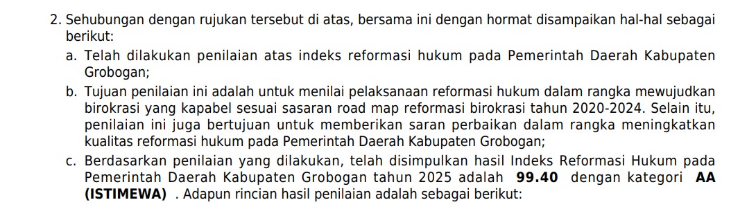 Perlu diketahui, nilai akhir 99.40 diperoleh setelah Kementerian Hukum selaku Leading Institutional IRH memberikan Nilai Apresiasi sebesar 2.40 kepada Pemerintah Kabupaten Grobogan, yang ditambahkan ke Nilai Awal 97.00.